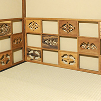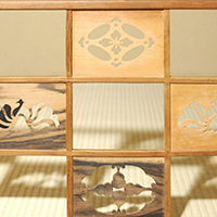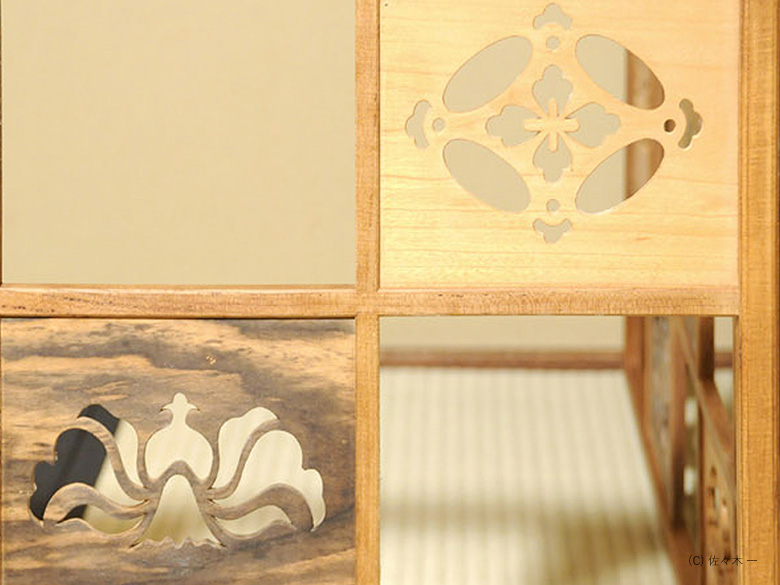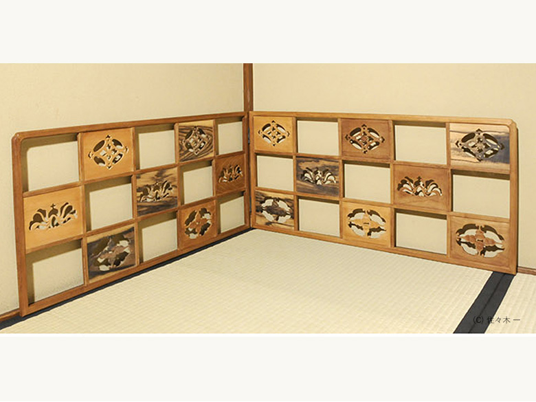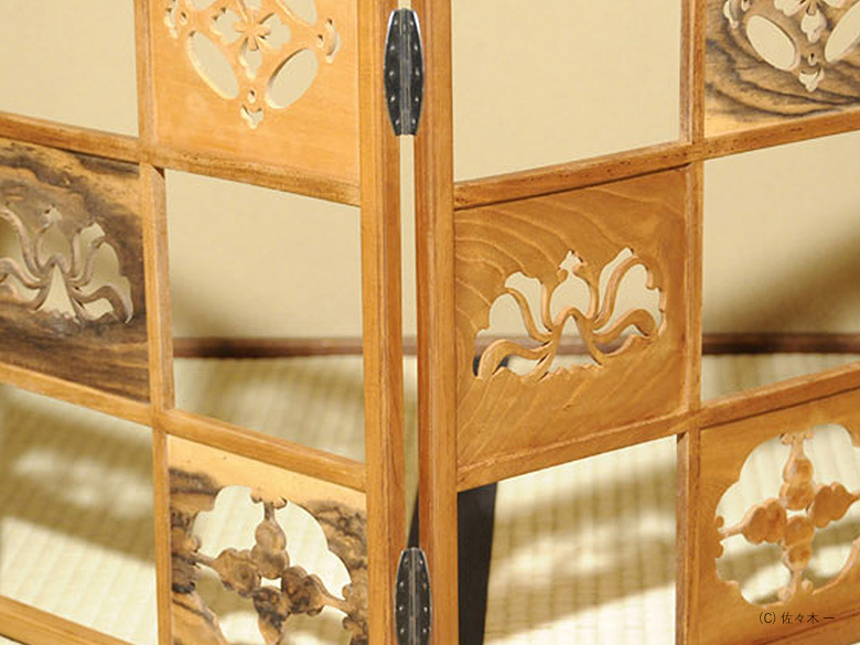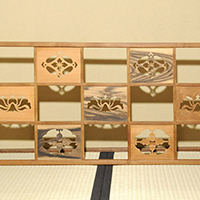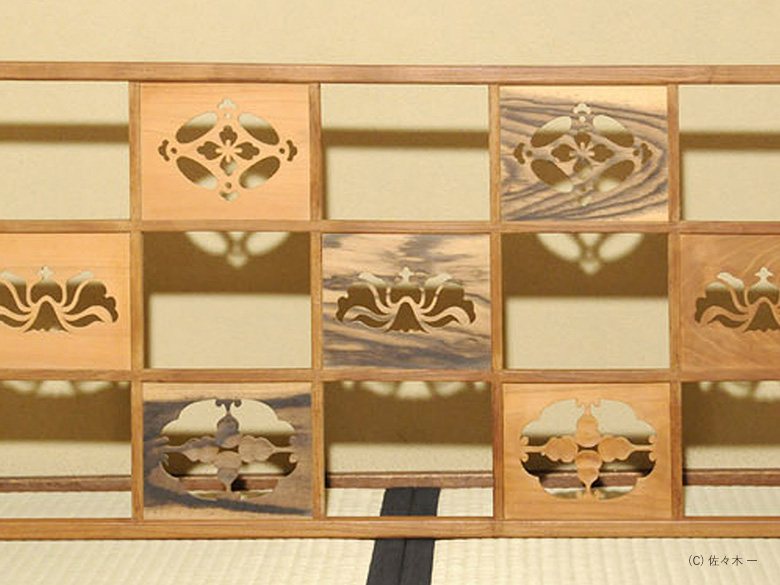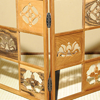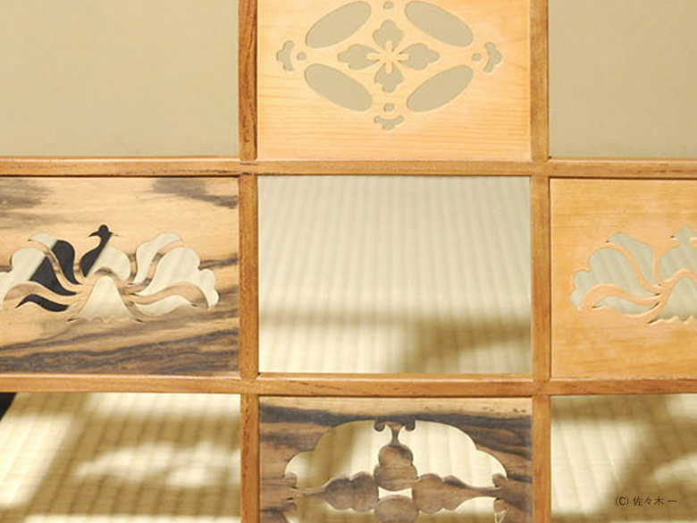 小堀遠州流とは 流祖 小堀遠州 流派について 遠州ごのみ 賛助会員募集 遠州ごのみ 遠州好 寄木 市松文 風炉先屏風 小堀宗通箱書 材木は桑・桜・縞柿で、文様は七宝透かし・牡丹文様・瓢透かしです。瓢箪の面の中はすくいぎみに彫られ、縁、透かしの角を全部面取りされており、柔らかで華やかな印象です。 一覧ページへ メニュー