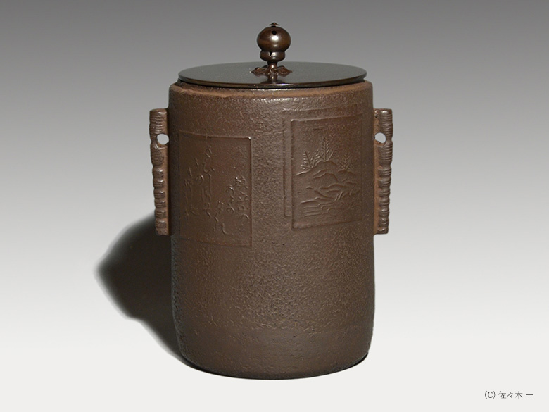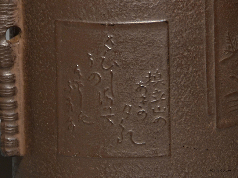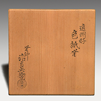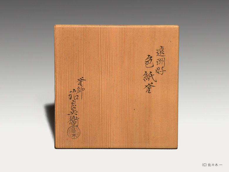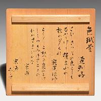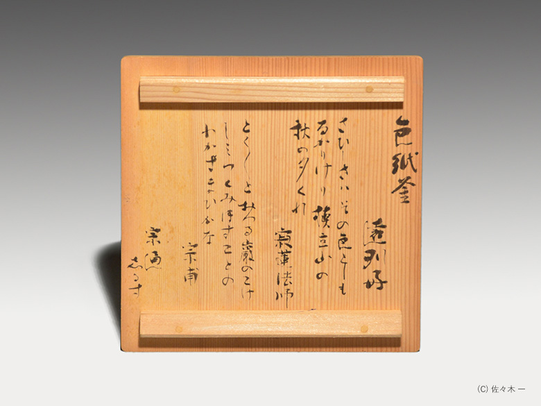 小堀遠州流とは 流祖 小堀遠州 流派について 遠州ごのみ 賛助会員募集 遠州ごのみ 遠州好 色紙釜 四代 高木治良兵衛 小堀宗通箱書 色紙釜とは色紙の文様がある茶の湯釜のことで、筒型・笛鐶付が約束です。色紙には西行法師の歌で「とくとくと落る巌のこけしみず汲みほすかずのわが住居かな」 秋の三夕の寂連の歌で「さびしさは その色としも なかりけり 槙立山の 秋の夕暮れ」 と書かれています。色紙の絵は狩野探幽といわれています。 一覧ページへ メニュー