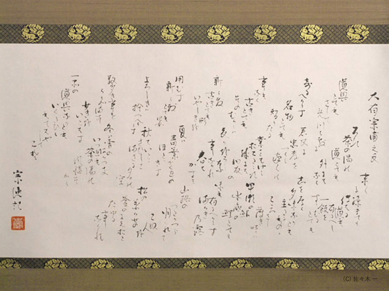 道具とても さして珍器によるべからず 名物とても異りたる事もなく 古き道具とてもその昔は新し 唯先達より伝りたる道具こそ名物ぞかし 旧きとても形いやしきは用いず 新しきとても形よろしきは捨つべからず 数多きをうらやまず 少きをいとはず 一品の道具なりとも幾度ももてはやしてこそ 子孫に伝ふる道もあるべし