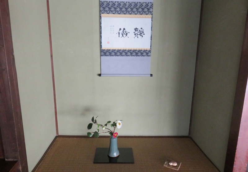 今回は東松山茶華道連盟 初代会長 澤田宗俊先生を偲び、先々代宗通家元筆の軸、真葛焼の水指等、澤田先生から受け継いだお道具類、そして茶杓は先代宗圓家元作 「一箭」 、清晨庵製の菓子 「桃花」 でおもてなし致しました。