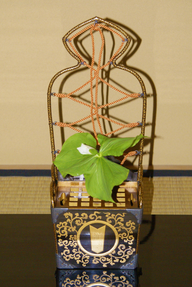 家元席(楓の間)には、寄付に家康公配下の武将の図、本席に家康公筆「から衣」の和歌色紙が掛けられました。徳川家のご先祖発祥の地三河松平郷が、京から下って来た在原氏の領地であり、初代松平親氏がその娘と婚姻を結び徳川家繁栄の礎を築いたことにちなみ、武家風の「むかしをとこ」を主題とし、箙(えびら)型の花入や志戸呂の茶入などで組み立てました。