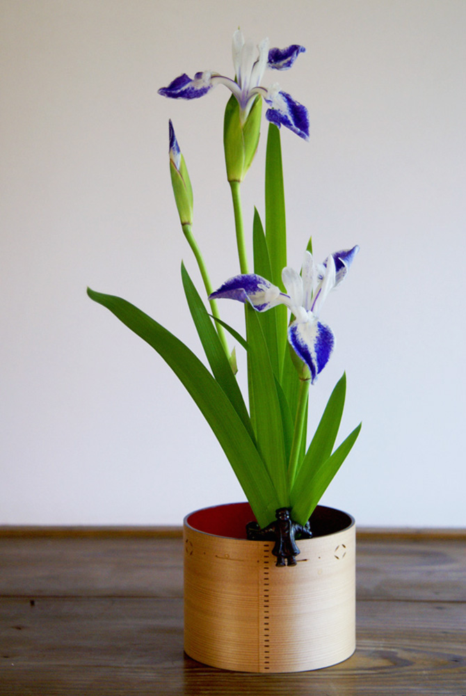 写真の花は江戸時代の光格天皇が名前を付けた「折り鶴」と言うカキツバタ。京都御所から鎌倉のお寺に株分けされ、大切に育てられたお花です。 先代宗通家元のお好みの建水(茶道具)に三閑人の蓋置きを掛けて生けました。 写真は無いのですが、光格天皇の父君・慶光天皇の書かれた色紙も飾り親子で茶室を彩って頂きました。 お客様を、王朝の時にいざなって、その時代の風を感じて頂く・・・ 王朝文学に造詣の深かった小堀遠州を祖に持つ流儀ならではの楽しみ方の一つです。