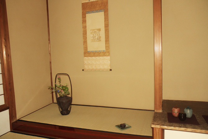 寄付とした円成庵に十一代宗舟の軸を掛け、お客様はそのまま水屋を通り抜け、本席にお入りいただきました。