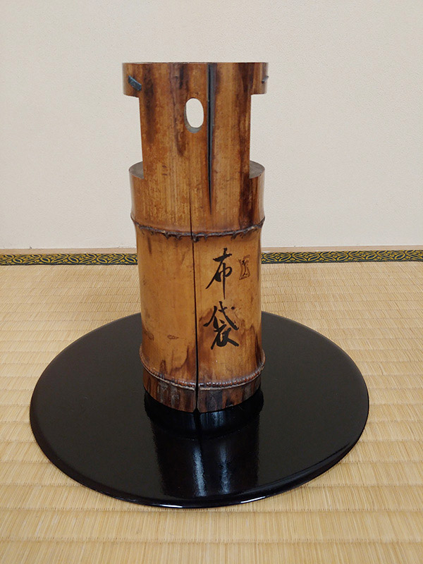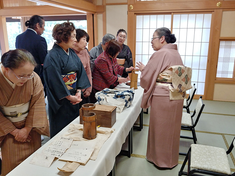 午前中は、法身寺中興開基である四代宗舟をはじめとした小堀家のお墓をお参りした後に、家元が持参した2本の竹の花入について説明され、普段は見られない花入の裏側に書いてある銘や箱書などを拝見しました。