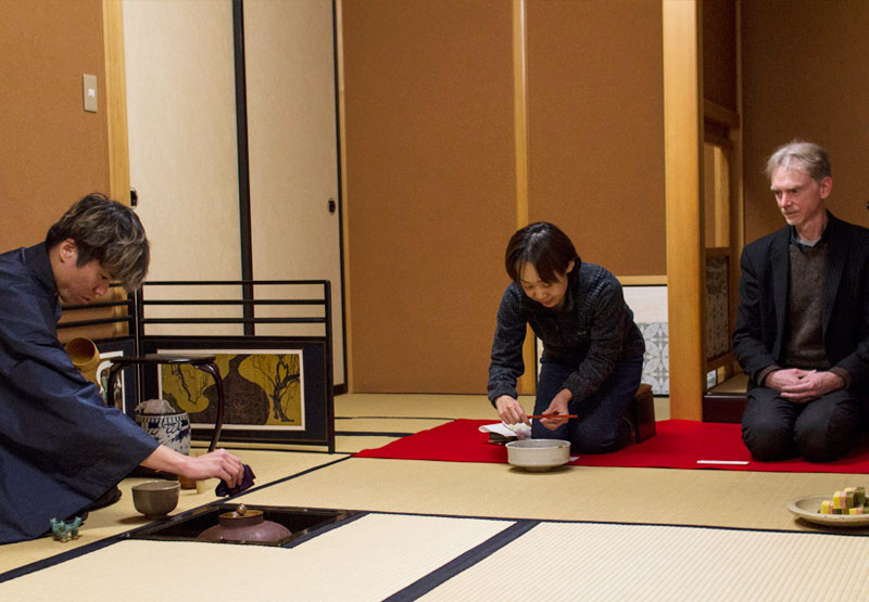 まずは茶席に入って掛軸やお花を拝見していただき、お点前では法身寺でのお稽古でお出ししている一幸庵製の茶菓子を、薄茶で召し上がっていただきました。