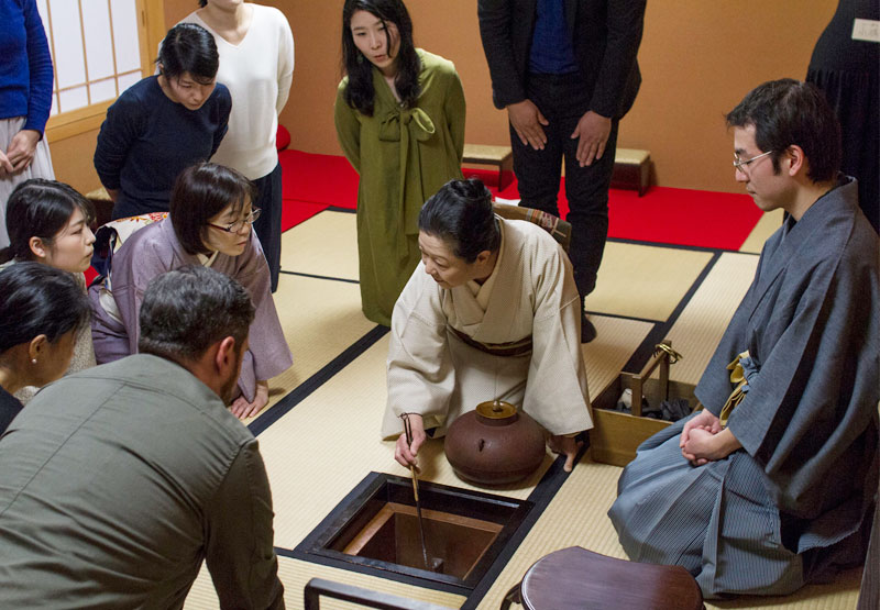 午後の部では釜と炭でお茶室が程よく暖まって、茶道に用いる炭にも話題がおよび、お点前の後には、当流が使っている炭や灰をご覧いただきました。