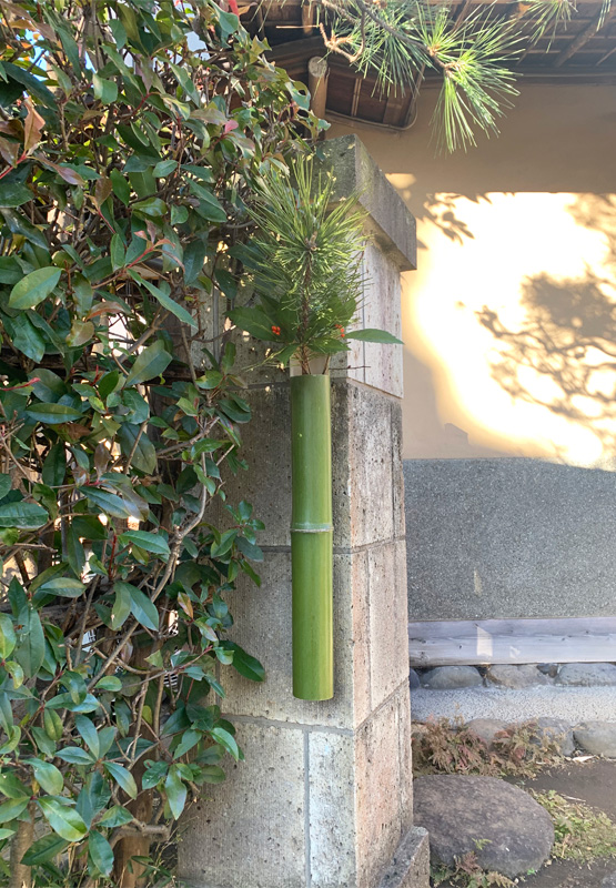 今回も直前まで新年準備に追われたものの、納会がなかったため少し余裕がありましたので、門飾り用の花入を別宅の竹林で切ってきて作ってみました。松とすでに綻びかけていた庭の梅を入れ、松竹梅の取り合わせとしました。