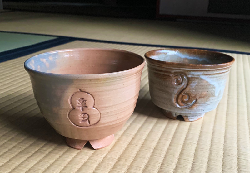 朝日焼十六世松林豊斎氏よりお送りいただいた辛丑のお茶碗(左)と先々代猶香庵作丑年茶碗(右)