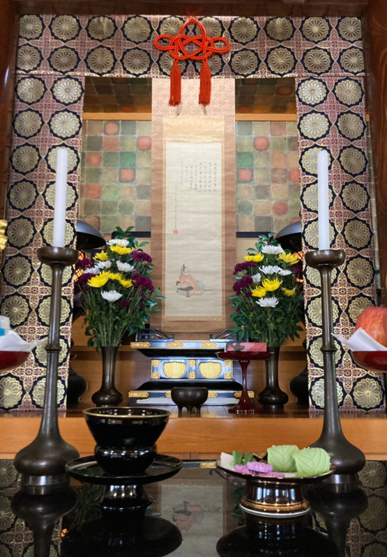 まず本堂で、小堀宗峯家元嗣により点てられた一服が仏前の小堀遠州流(当流)十二代家元宗舟政休筆 遠州寿像前に献じられました。続いて、法身寺の小菅大徹先代ご住職と小菅哲成ご住職による読経と焼香で合掌し、遠州公の遺恩に拝謝いたしました。