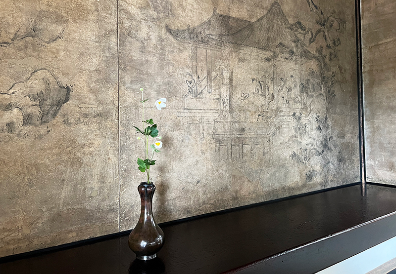 幸いにも、近江の三井寺から移された重要文化財の護国寺・月光殿を使わせていただくことができましたので、書院造りの床の間に唐物や文房具を飾り、格式あるしつらえをご覧いただき、席は立礼でゆったりと座っていただきました。