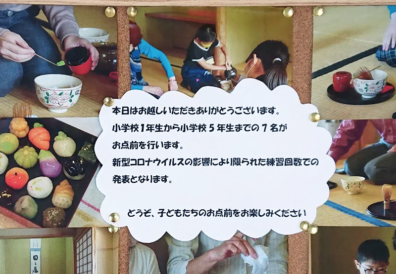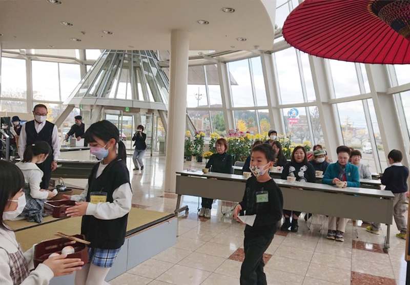 例年実施している茶会については、芸術祭に訪れるお客様に「子供たちのお茶会が無いと寂しいです」と暖かい言葉を頂き、11月6日(日)に久慈市芸術祭会場のアンバーホールのエントランスホールで実施することとなりました。
