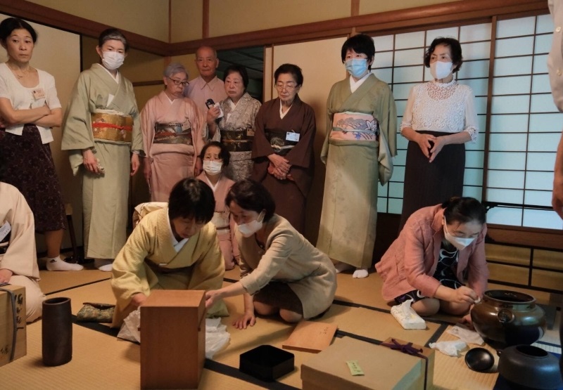 全国より参加した100名超の方々が4つの茶席でお客様とおもてなしする側に分かれ、猛暑のため平服も可として研修を行いました。