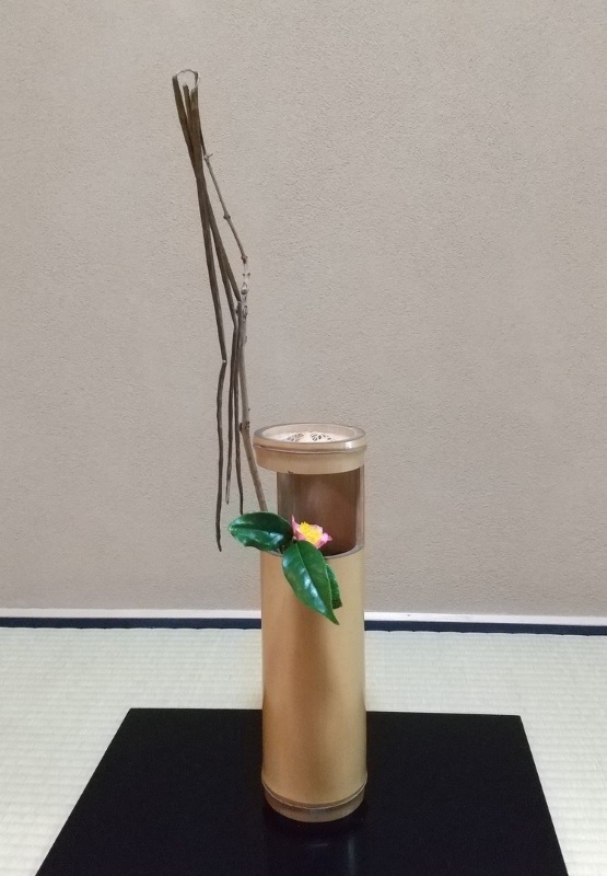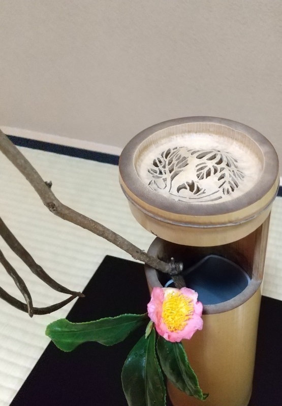 菊透かしのある竹一重切の花入に、今日の為に咲いてくれたかのような椿『炉開き』を・・・
