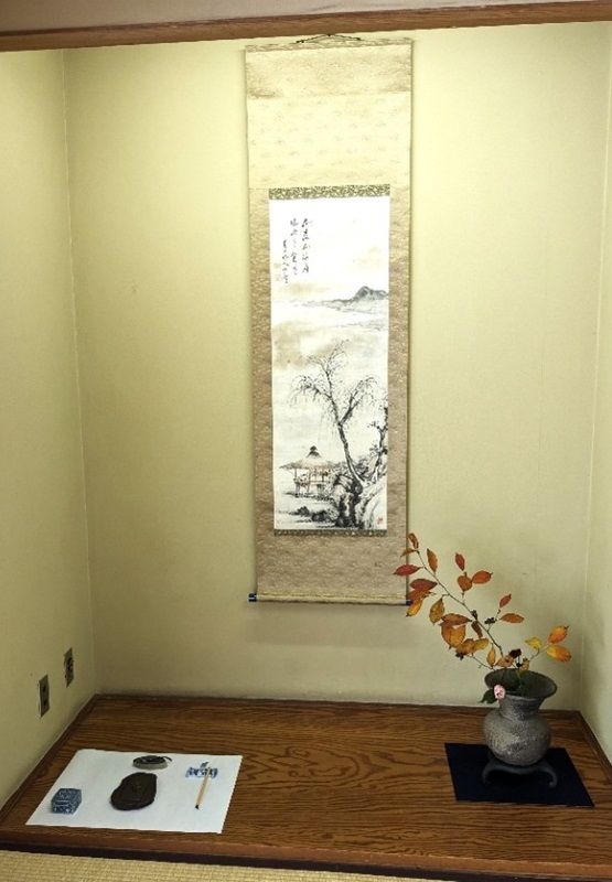 市民文化祭の一環として毎年市民茶会が開かれ、今年は43回目を迎え、和室を担当しました。今世界で起こっている争い事、 自然災害による貴重な文化の崩壊の続く中でも大切に受け継がれて来た茶道具で道具組をしてみたいと思い、床に直入画を掛け、 明治時代に奈良で発掘された須恵器に大きな沙羅の照葉をいれてみました。 明代の硯屏を据えお客様とゆったりと時を過ごす落ち着いた時間を共にできたことに感謝の一日でした。