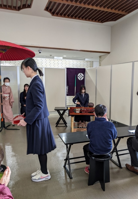当日は、席主・点前・運び・水屋・受付等の仕事を全員で交代しながら分担し、11席を設けました。点前と席主を別の高校で組んで務めたり、声を掛け合って菓子やお茶を運んだりして、活動を通して交流する姿が見られました。