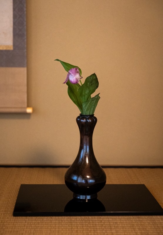 家元席の楓の間の床には、新家元の決意を示す沢庵一行の「諸悪莫作衆善奉行」が掛けられ、古銅柑口にいけられた稀少な花、敦盛草の美しさが際立つ。