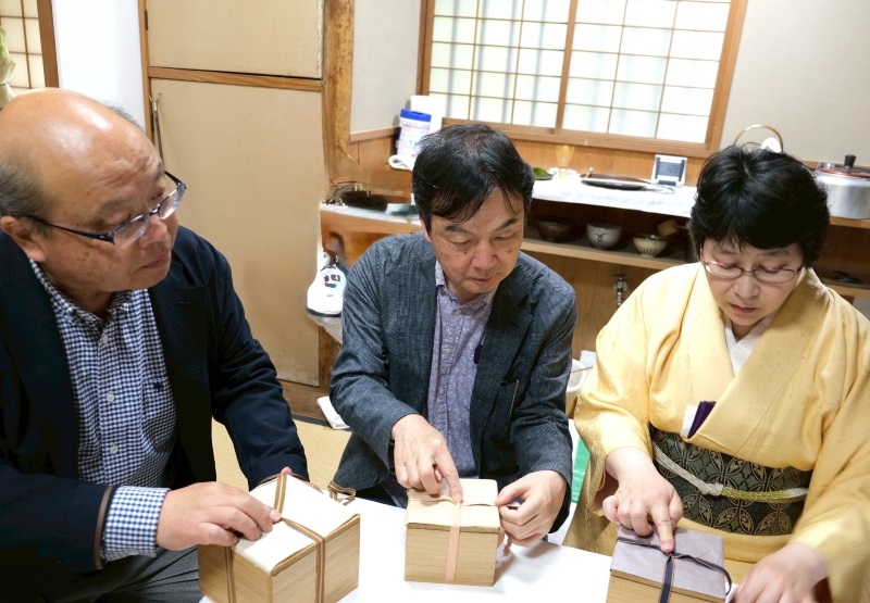 今回は15名の会員が参加し、普段はお軸や釜を箱から出された状態からお稽古を始めることが多いため、この機会に扱い方を一から学んだほか、お茶事のための普段の稽古では学ばない、大寄せ茶会の運営について、水屋でどのように動くべきかなど全体の流れを把握しながら学びました。