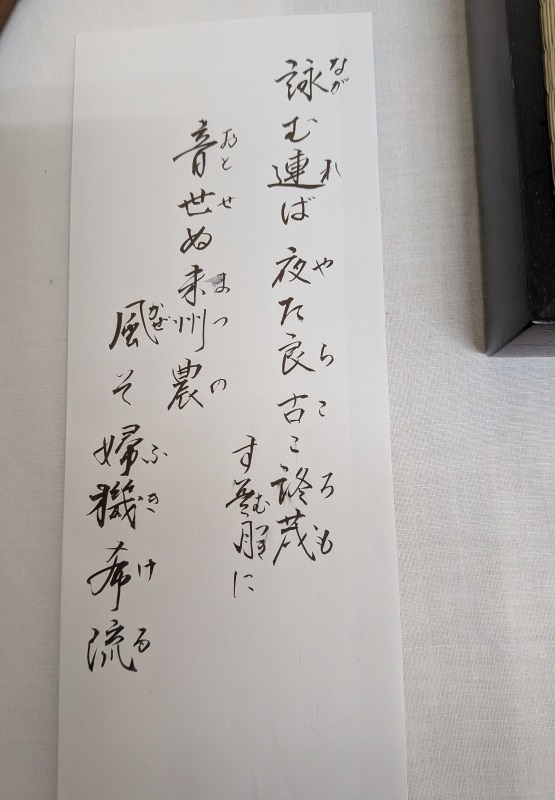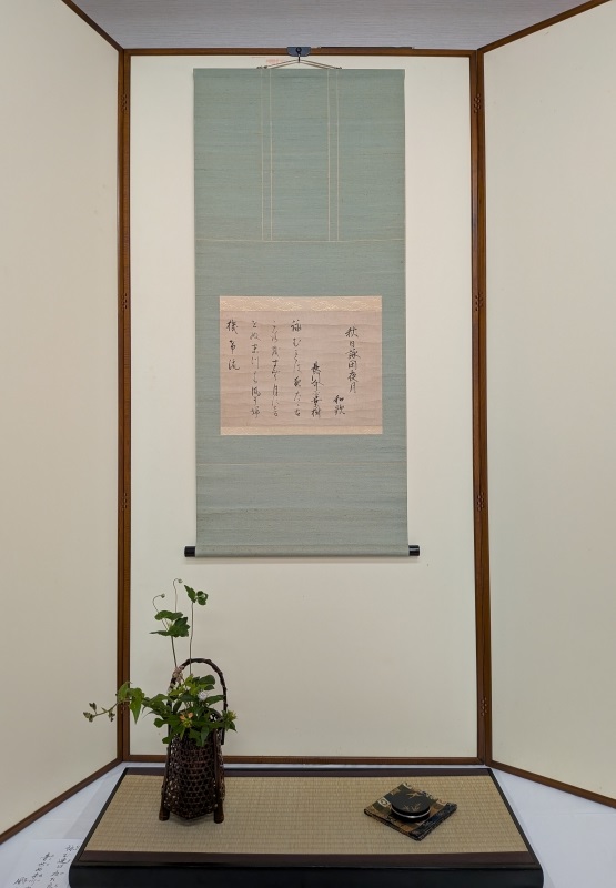 床の軸は、鳥取市生まれの歌人、長門之介平景樹の書「秋日詠閑夜月」和歌「ながむれば やたらこころも すむつきに おとせぬまつの かぜぞふきける」が掛けられました。和歌の実際は漢字まじりの表記ですので写真を参照してください。茶会の翌日6日はちょうど中秋、7日は満月にあたり、お客様と「いい月が眺められるといいですね。でも、ちょっと天気が不安ですね。」という話題になりました。