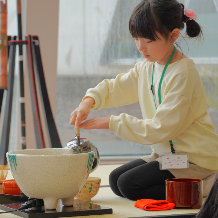 子供茶道教室茶会 報告 アンバーホールエントランスの会場において、盆点前でお客様をお迎えしました。 岩手支部11月4日