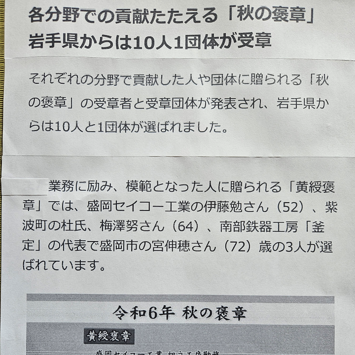令和6年「秋の褒章」で、岩手支部の宮伸穂(宗穂)氏が黄綬褒章を受章 おめでとうございます。
